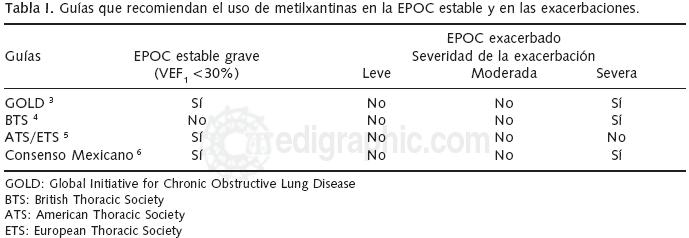 En la Tabla I se presenta un listado de guías y consensos aceptados para el diagnóstico y tratamiento de la EPOC, así como las recomendaciones sobre el uso de metilxantinas. Prácticamente todas las guías las recomiendan en la EPOC estable, cuando el tratamiento con β2 agonistas y anticolinérgicos ha fallado y siempre en combinación con algún broncodilatador de corta acción (salbutamol, terbutalina, ipratropio) con nivel de evidencia B (evidencia obtenida a partir de ensayos clínicos aleatorizados controlados pero con grupos pequeños). Con respecto a la exacerbación de la EPOC se recomiendan principalmente en los casos severos en quienes el tratamiento convencional ha fallado, con nivel de evidencia no definido.