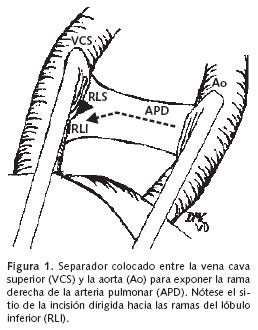 3. Mientras desciende la temperatura se inicia la exposición de ambas arterias pulmonares principales. La arteria pulmonar derecha (APD) se expone disecando circunferencialmente la vena cava superior (VCS) desde su desembocadura en la AD y la de la vena ácigos, hasta la del tronco braquicefálico, ayudada por tracción suave sobre una rienda o referencia de algodón o de hule. La disección de la VCS debe tener presente el curso del nervio frénico derecho para no lesionarlo. Es muy importante que la punta de la cánula venosa superior rebase a la desembocadura de la ácigos cuando menos por un par de centímetros, para evitar su canulación inadvertida; además, la ligaduracincho de cava debe quedar debajo de la ácigos para evitar que su flujo sanguíneo llegue a ventrículo derecho (VD) y produzca recalentamiento; también importa dejar libre, sin ligar o cinchar, la vena ácigos ya que representa una vía de retorno venoso de miembros inferiores al tórax. La aorta se diseca circunferencialmente lo suficiente para observar todo el trayecto y origen de ambas ramas pulmonares. Para disecar la arteria pulmonar izquierda (API) puede no ser necesario seccionar el ligamento arterioso. Expuestas e individualizadas las arterias pulmonares principales de la aorta y VCS, se realiza la disección intrapericárdica del nacimiento de las arterias lobares; la disección de esta zona hiliar se hace exclusivamente por delante, sin tratar de disecarlas circunferencialmente ni entrar a las cavidades pleurales; aquí se detiene la disección.