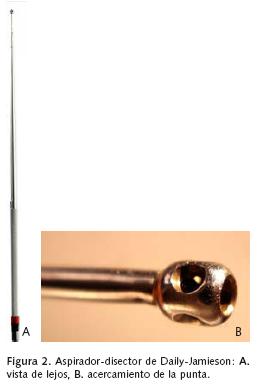 El plano de disección se puede encontrar muchas veces con el disectorsuccionador de DailyJamieson, instrumento indispensable para la realización correcta del procedimiento (Figura 2); si el trombo está muy fibroso y adherido a la pared, se requiere realizar un corte fino con hoja de bisturí No. 15 en el fondo de la arteria para localizar el plano entre endotelio y muscular, buscando un plano blancoamarillento, paso crucial para comenzar la endarterectomía, pues si se aborda más profundo se lesionan la media y la adventicia arteriales, con probabilidades de perforación, sangrado, etc.; el problema se reconoce porque aparece un plano rosado o con huellas de sangre, evidencia de estar en la adventicia o hasta afuera del vaso, lo que requiere reparación inmediata. Ya obtenido el plano deseado se realiza la disección del mismo, obteniéndose el molde del trombo traccionando gentil y progresivamente con pinzas largas de disección vascular, pinzas fuertes o de Allis para no perder el trombo ni el plano de disección, ya que si se retrae se tarda en recuperar el trombo; toda la disección se realiza con el aspiradorsuccionador que permite disecar y visualizar perfectamente el plano y obtener sucesivamente, en ese orden y en una pieza los trombos organizados de las ramas superior, inferior y media (Figura 3). Se verifican limpieza interior y reflujo adecuados, se cierra la APD con doble surjete de prolene 50, pues el 60 es difícil de manipular sobre todo si la pared de la arteria es gruesa y fibrosa. Al principiar el primer plano de la sutura se ordena el reinicio de la CEC por espacio de 10 minutos.