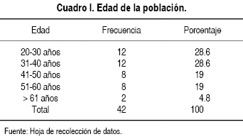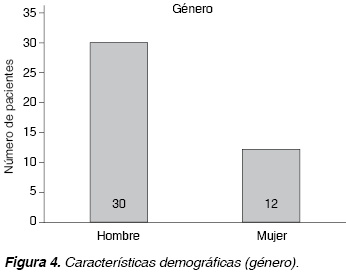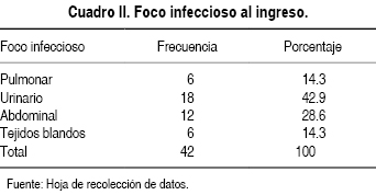 Se incluyó un total de 42 pacientes. De éstos, 30 (71.42%) fueron hombres y 12 (28.58%) mujeres (Figura 4). De los 42 pacientes que se ingresaron al estudio, la edad media de población muestra fue de 39 ± 15 años, con un mínimo de 21 años y un máximo de 66 años de edad (Cuadro I). En cuanto al foco infeccioso a su ingreso, el urinario fue el que más se presentó seguido por el abdominal (Cuadro II). Las variables vitales medidas en los 42 pacientes fueron la frecuencia cardiaca con un mínimo de 58 por minuto, un máximo de 141 por minuto, con una media de 95 ± 21, en lo que respecta la frecuencia respiratoria tuvieron un mínimo de 14 respiraciones por minuto, con un máximo de 28, una media de 18 ± 4, la presión arterial media presentaron un mínimo de 56 mmHg, con un máximo de 76 mmHg, con una media de 64 ± 4.8 y la temperatura presentaron un mínimo de 35.2 oC, un máximo de 39 oC, con una media de 37.9 ± 0.9.