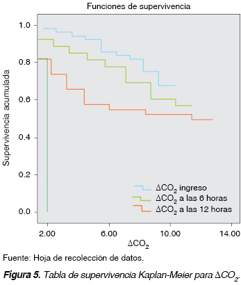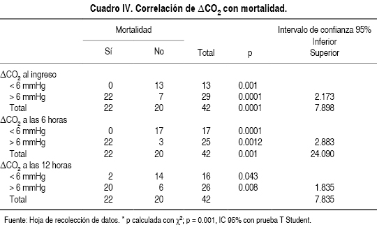 En este estudio se correlacionó con mortalidad, el ΔCO2, en el cual los pacientes que tuvieron a su ingreso < 6 mmHg de los 13 pacientes que tuvieron esas cifras ninguno llegó a fallecer, mientras que los pacientes que tuvieron ΔCO2 > 6 mmHg al ingreso fueron 29, de los cuales 22 pacientes (52%) del total de la población fallecieron, mientras que a las 12 horas, los pacientes aun teniendo un ΔCO2 < 6mmHg, 2 fallecieron, con un p significativa < 0.05. Esto es que entre mayor tiempo del estado de choque, los pacientes pueden llegar a fallecer aun teniendo un ΔCO2 menor a 6 mmHg; sin embargo se incrementa más la mortalidad teniendo un ΔCO2 mayor a 6 mmHg, esto ha sido descrito por Mecher y Vallée.23,30