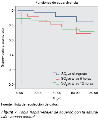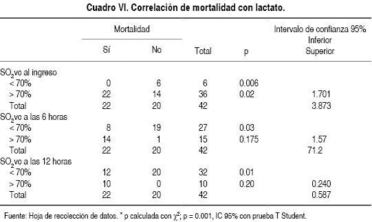 Los pacientes que tuvieron una saturación venosa central al ingreso > 70%, 22 de los 36 pacientes fallecieron, con una p significativa de 0.0006, a las 6 horas los pacientes que tuvieron < 70% fallecieron 8 y a las 12 horas 12 pacientes. Los que presentaron una SO2vc a las 6 y 12 horas, fallecieron 14 y 10 pacientes, respectivamente, la cual presenta una p de 0.175, no es significativa, por lo que la SO2vc no tiene tanta correlación como lo es lactato o el ΔCO2, esto pudiera ser por la toma de sangre en catéter venoso central, el cual no pudiera estar adecuadamente colocado y la SO2vc no es real, diferencias descritas por Krafft P.31