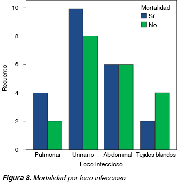 En cuanto a su ingreso, los pacientes que tuvieron un ΔCO2 < 6 mmHg fueron 13 (31%) y 29 mmHg > 6 fueron 29 pacientes (69%) con una media de 9.0 ± 4. Con lo que respecta al lactato al ingreso, los pacientes que tuvieron < 4 mmol fueron 26 (61.9%) y los que tuvieron > 4 mmol fueron 16 (38.1%), con un mínimo de 1 mmol, máximo de 15 y una media de 4.7 ± 3.4. Los pacientes que tuvieron una SO2vc < 70% fueron 6 (14.3%) con un mínimo de 51%, un máximo de 74% y una media 62.5 ± 6.0. Con respecto a las 6 y 12 horas de ingreso, las determinaciones del ΔCO2, lactato y SO2vc fueron las siguientes en el cuadro III. En cuanto a las correlaciones con mortalidad, el ΔCO2 al ingreso < 6 mmHg de los 13 pacientes que tuvieron esas cifras, ninguno llegó a fallecer, mientras que los pacientes que tuvieron ΔCO2 > 6 mmHg fueron 29, de los cuales 22 pacientes (52%) del total de la población fallecieron, mientras que a las 12 horas, los pacientes que tuvieron un ΔCO2 < 6 mmHg 2 pacientes fallecieron (Figura 5 y Cuadro IV). Se realizó un cuadro de Kaplan-Meier para supervivencia de acuerdo con el ΔCO2 al ingreso, a las 6 horas y a las 12 horas. Con respecto al lactato, de los 26 pacientes que tuvieron lactato al ingreso < 4 mmol, 6 pacientes fallecieron, mientras los que tenían lactato mayor a 4 mmol, 16 pacientes fallecieron, con una p significativa menor a 0.05 (Cuadro V). Asimismo se muestra en la tabla de supervivencia según Kaplan-Meier para lactato (Figura 6). Los pacientes que tuvieron una saturación venosa central al ingreso > 70% 22 de los 36 pacientes fallecieron, con una p significativa de 0.02 a las 6 horas los pacientes que tuvieron < 70% fallecieron 8 y a las 12 horas 12 pacientes. Los que presentaron una SO2vc > 70% a las 6 y 12 horas, fallecieron 14 y 10 pacientes, respectivamente, lo cual presenta una p de 0.175 (Cuadro VI). En el cuadro de Kaplan-Meier se observa disminución de la supervivencia con saturaciones por arriba de 70% (Figura 7). El riesgo relativo para mortalidad por choque séptico de acuerdo con el ΔCO2, lactato y SO2vc al ingreso, a las 6 horas y a las 12 horas, donde se observa mayor riesgo de mortalidad hasta 6.15 veces más en ΔCO2 a las 12 horas, mientras el lactato el riesgo es mayor al ingreso y en cuanto a la SO2vc el riesgo es más alto en las primeras 6 horas (Cuadro VII). En cuanto a mortalidad general en el estudio fueron 22 pacientes del total de la muestra que fue de 42, esto equivale a 52.3% de los cuales 10 pacientes (45.4%) presentaron foco infeccioso a nivel urinario, 6 (27.2%) a nivel abdominal, 4 a nivel pulmonar (18.1%) y a nivel de tejidos blandos 2 (9.0%) (Figura 8). En cuanto a los días de estancia en la Unidad de Cuidados Intensivos el promedio fue de 7.1 ± 3.5 días con un mínimo de 1 día y un máximo de 21 días.