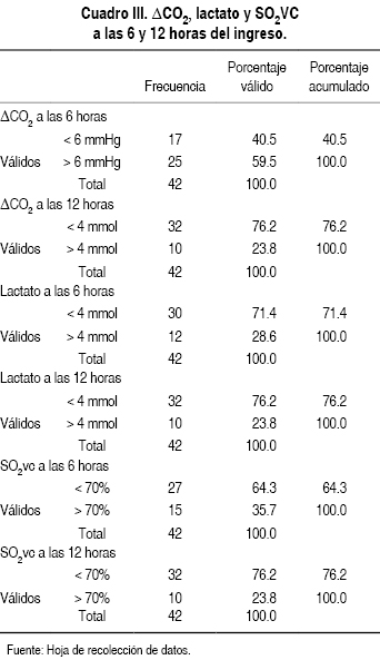 En nuestro estudio se combinaron las variables ΔCO2, lactato y SO2vc, observándose a su ingreso, los pacientes que tuvieron un ΔCO2 < 6 mmHg fueron 13 (31%) y 29 mmHg > 6 fueron 29 pacientes (69%) con una media de 9.0 ± 4. Con lo que respecta al lactato al ingreso, los pacientes que tuvieron < 4 mmol fueron 26 (61.9%) y los que tuvieron > 4 mmol fueron 16 (38.1%), con un mínimo de 1 mmol, máximo de 15 y una media de 4.7 ± 3.4. Los pacientes que tuvieron una SO2vc < 70% fueron 6 (14.3%) con un mínimo de 51%, un máximo de 74% y una media 62.5 ± 6.0.