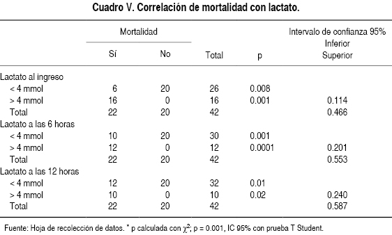 En este estudio de los pacientes que se les midió lactato,22 quienes tuvieron al ingreso lactato de < 4 mmol, 6 pacientes fallecieron, mientras los que tenían lactato > a 4 mmol, 16 pacientes fallecieron, con una p significativa menor a 0.05, mientras que la mortalidad incrementa con mayor tiempo de estado de choque a pesar de tener un lactato menor a 4 mmol, con una p significativa de 0.02, descrito como marcador de hipoperfusión en pacientes críticos por Gutiérrez y cols.15
