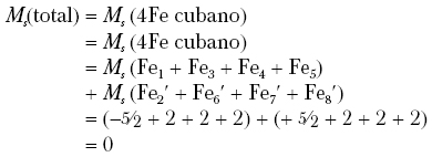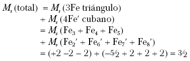 De acuerdo con la fórmula propuesta (Lee, 1997), [MoIVFeIII6FeII9S2]+ se tiene un conteo formal de 43 electrones d. Asumiendo que los iones metálicos son de alto espín, existen muchos patrones de alineación de espín que satisfacen S = 3/2. Considerando al MoIV, con configuración d2, en un entorno octaédrico de bajo espín con ligantes unidos por O, N y S, el estado de espín de S = ±3/2 resulta del apareamiento de un ión férrico (FeIII, d5, alto espín, S = 5/2) y seis iones ferroso (FeII, d6, alto espín, S = 2). La condición de tres electrones desapareados puede satisfacerse alineando los vectores de espín en los sitios Fe de la siguiente manera:
