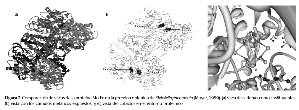 Para formar la enzima activa nitrogenasa se requiere una molécula del componente I o proteína Fe-M, y dos moléculas del componente II o proteína sólo hierro. En la figura 2 se muestran la proteína y el cofactor en su entorno proteico, aislada de la bacteria Klebsiella pneumoniae.