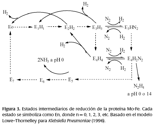 En la figura 3 se muestra el esquema de reducción de la proteína Fe-Mo, en el que cada uno de los estados intermediarios corresponde a un ciclo en que la proteína sólo hierro cede un electrón a la Fe-Mo, a la par que lleva a cabo la hidrólisis de dos equivalentes de ATP. El ciclo completo involucra ocho electrones y 16 moléculas de ATP.