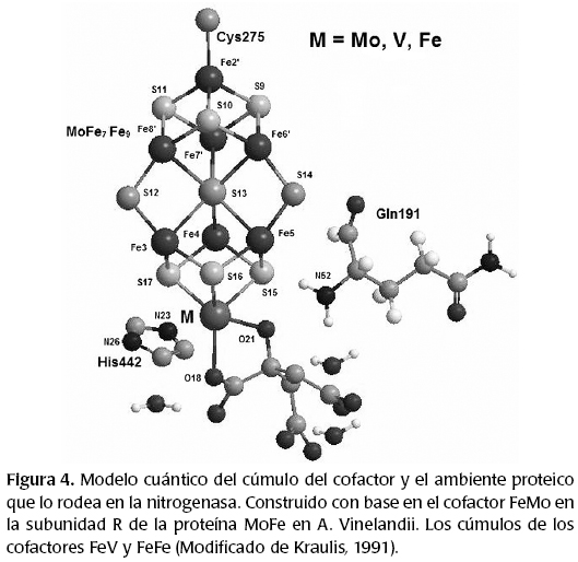 De acuerdo con Lee (1997), en la nitrogenasa molibdeno, el heterometal en el cofactor tiene un estado de oxidación IV por lo que mantiene dos electrones en su capa d. Análogamente se tiene el escenario isoelectrónico del cofactor hierro-vanadio (FeVco), en el que el vanadio se encuentra en estado de oxidación III.