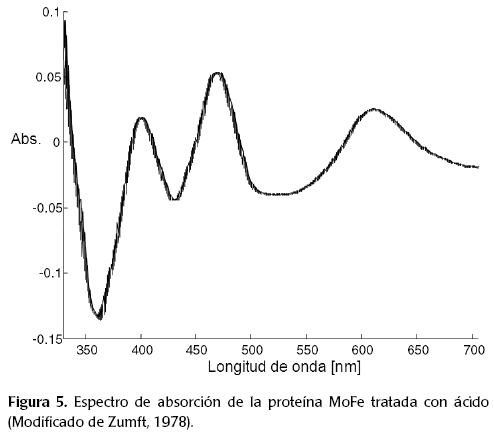Para este tipo de especies se sabe que el sitio suele presentar paramagnetismo, al ser imposible aparear sus dos únicos electrones d. Las transiciones electrónicas de la proteína Fe-Mo, en medio ácido pueden observarse en el espectro de la figura 5.