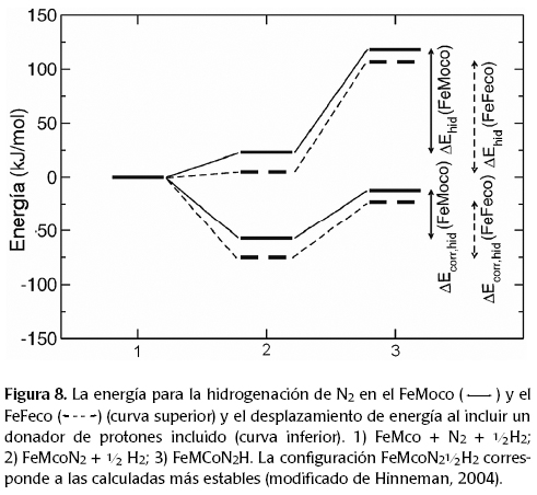 En la figura 8 se muestran los resultados de la energía involucrada en la hidrogenación de la molécula de nitrógeno. Puede observarse que sin importar el modelo utilizado, la reacción con la nitrogenasa de molibdeno requiere mayor energía que la de sólo hierro.
