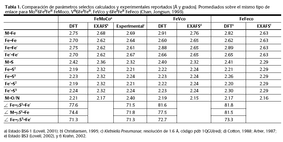 Las geometrías optimizadas de los cofactores FeMo, FeV y FeFe en el estado BS3 se comparan en la figura 7. En ésta se observa que el entorno químico permanece invariante, de modo que las estructuras observadas se mantienen considerablemente similares. Los parámetros geométricos, obtenidos mediante Teoría de Funcionales de Densidad, espectroscopia de absorción extendida de rayos-X de estructura fina y por caracterización biológica se comparan en la tabla 1.