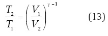 Sea r = 2 la relación de compresión inicial. De acuerdo con (13), la temperatura al final del proceso de compresión adiabática 1 → 2 será entonces T2 = 382.66 K. La temperatura al final del calentamiento isométrico es Tx = 573.99 K