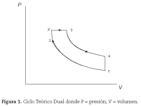 En los motores Otto y Diesel el proceso de combustión se simula como un proceso de adición de energía en forma de calor a volumen constante o a presión constante (Cengel y Boles, 2003; Van Wylen et al, 2000; Wark y Richards, 2001). Un enfoque más realista pero más complejo sería modelar el proceso de combustión, tanto en motores de gasolina y Diesel, como una combinación de dos procesos de transferencia de calor, uno a volumen constante y el otro a presión constante (Cengel y Boles, 2003). El ciclo ideal basado en este concepto recibe el nombre de ciclo dual y el diagrama P-V se representa en la figura 1. Se considera que el ciclo en estudio es un sistema cerrado y el aire está confinado en un dispositivo pistón-cilindro. Se toma como base una cantidad de sustancia igual a 1 kg de aire.
