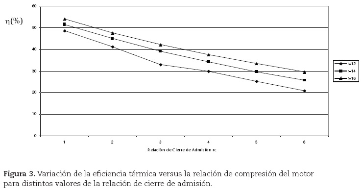 En la figura 4 se representa la variación de la eficiencia térmica con la relación de cierre de admisión para un valor determinado de la relación de compresión. Se observa que el rendimiento térmico decrece rápidamente al aumentar la relación de corte, para una relación de compresión dada (tabla 3). Para un valor de la relación de corte, el rendimiento térmico es mayor a medida que se incrementa la relación de compresión.