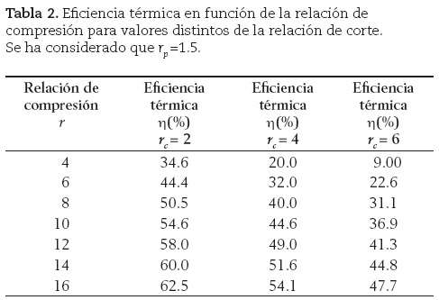 En la tabla 1 se muestra la variación del trabajo neto con la relación de compresión para una relación de relación de presiones de 1.5 y relación de cierre de admisión de 2. Se observa cómo disminuye el trabajo neto a medida que aumenta la relación de compresión. Es interesante mencionar el hecho de que, en general, los textos de termodinámica (Burghardt, 1984; Van Wylen et al., 2000; Cengel y Boles, 2003) no hacen referencia a este comportamiento. De hecho son pocos los textos de termodinámica que incluyen el ciclo dual cuando hacen el estudio de los ciclos de potencia de gases.