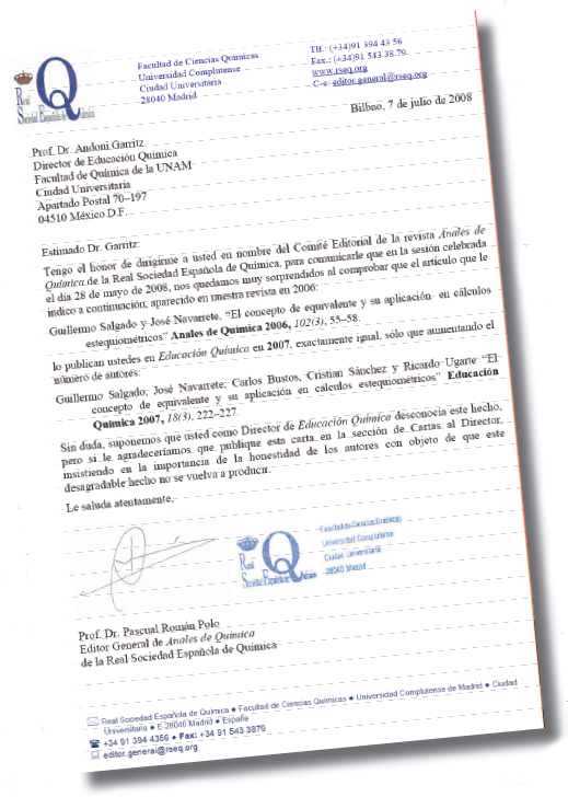 Quiero decirle que recibí la carta anexa de la Real Sociedad Española de Química en donde me hacen ver que su artículo, publicado en Educación Química en el tercer número de 2007, había sido publicado idéntico en los Anales de Química en el año 2006, con la única diferencia en los autores que lo firman.