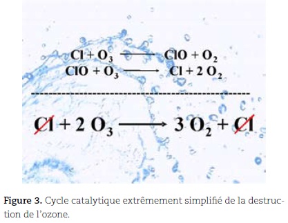 La chimie souffre en outre d'un nombre d'implicites extraordinaire, ce qui peut être illustré par l'anecdote suivante. Ayant un jour écrit au tableau un cycle catalytique extrêmement réduit de la destruction de l'ozone par les CFC,1 j'arrivais à l'équation bilan et la simplifiais en ôtant un atome de chlore des deux côtés (figure 3).