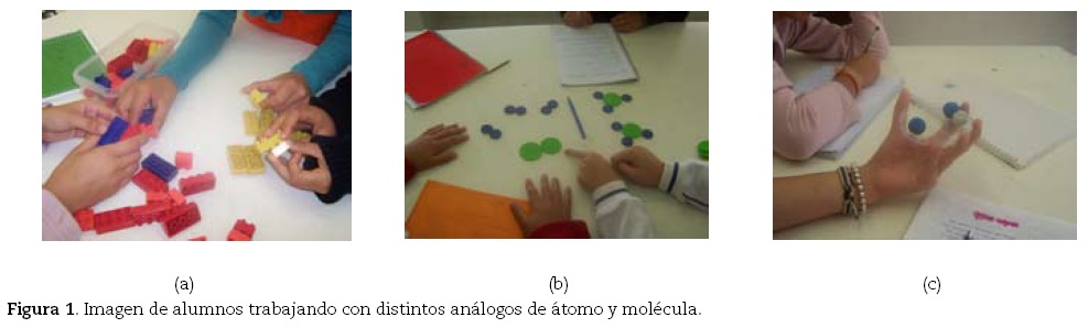En el caso particular de la representación analógica de las sustancias y de los cambios químicos se han propuesto diferentes análogos procedentes de la vida cotidiana para representar las unidades atómicas, como grapas y anillos (IPS, 1973), tuercas y tornillos (Fernández-González, 1979), o clips (Balocchi et al., 2005ab, 2006), entre otros muchos. En nuestra propuesta se recurre también a una cierta variedad de análogos para representar los sistemas con los que se trabaja. Así, para representar los átomos se emplean piezas del lego, fichas circulares de colores, frutas o bolas de plastilina; para visualizar moléculas se usan piezas del lego encajadas, fruteros o bolas de plastilina adheridas, y para representar el cambio químico se recurre a la reorganización de las unidades componentes de estos sistemas.