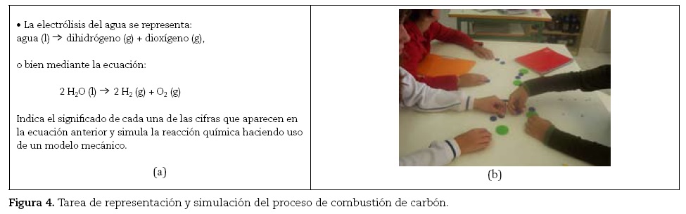 La figura 4a muestra un ejemplo de tarea planteada en nuestra propuesta desde esta perspectiva, mientras que la figura 4b presenta una instantánea con alumnos trabajando en la resolución de la misma. Como vemos, éstos debían de simular la reacción de descomposición del agua mediante fichas que representan los átomos, primero mentalmente y, más tarde, en formato real mediante un modelo analógico. Los fundamentos y los códigos de representación habían sido ya introducidos en actividades anteriores por lo que aquí únicamente se trataba de aplicarlos para visualizar la reacción química planteada.