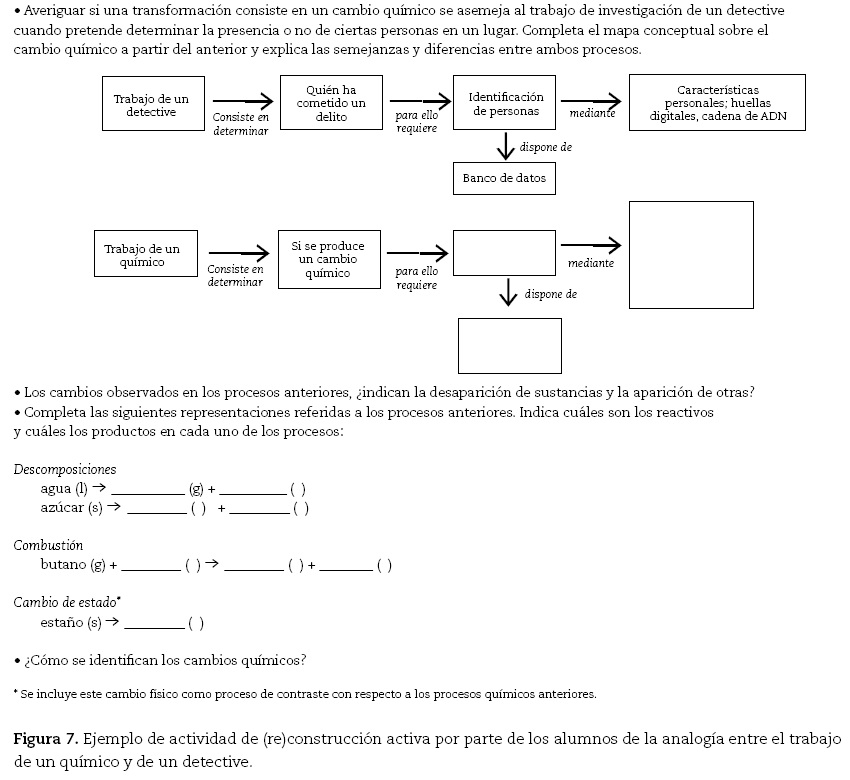 Un ejemplo de actividad de este tipo se propone al principio del desarrollo de la propuesta didáctica, cuando iniciamos a los alumnos en la diferenciación entre cambio químico y cambio físico a un nivel fenomenológico. Concretamente se plantea la actividad que recoge la figura 7, en la que los alumnos deben de (re)construir una analogía entre el proceso que siguen los químicos para identificar unos y otros cambios, y la labor de un detective para identificar personas en una investigación policial. Del mismo modo que en este último han de utilizarse las características personales de posibles sospechosos disponibles en un banco de datos, que se contrastan con las presentes en el escenario de la investigación, en el caso de los químicos se comparan las propiedades características de las sustancias que intervienen en un fenómeno con las que aparecen tabuladas en bases de datos, para ver si las sustancias son las mismas antes y después. Como puede comprobarse, la analogía sugerida no se presenta directamente sino que son los alumnos los que han de completarla valiéndose de un mapa conceptual. Para facilitar la labor del alumno, el mapa conceptual correspondiente al objeto (identificación de sustancias en el cambio químico) y al análogo (identificación de personas en una investigación policial) se plantearon con una estructura común.