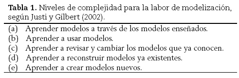 Desde el punto de vista del alumno como sujeto participante, es posible otorgarle distintos grados de implicación en la elaboración de un modelo en la escuela. Así, por ejemplo, Halloun (2007) distingue cuando se ha de construir un modelo nuevo, o si solamente se exige el desarrollo y aplicación de un modelo ya construido para resolver problemas racionales y empíricos y para desarrollar conocimiento. Por su parte, Justi y Gilbert (2002) proponen una clasificación más fina, estableciendo además una jerarquía en orden de menor a mayor complejidad de acuerdo al esquema propuesto en la tabla 1.