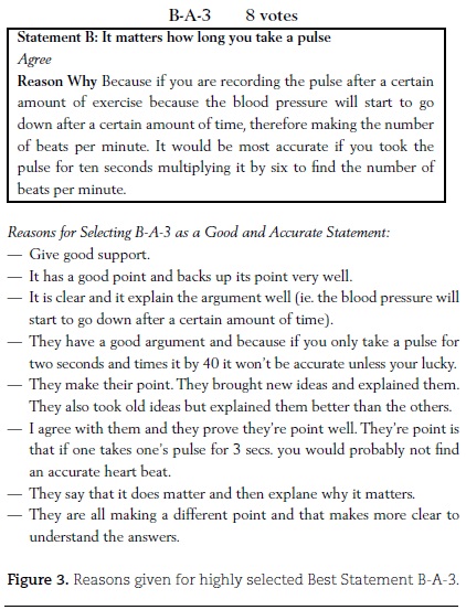 Upon completion of the write/post-a-note activity, we found that of the four statements, only the first two statements A and B produced a diversity of responses suitable for an assessment conversation on coordinating and conducting argumentation discourse activities. For this research report, our focus is only on Statement B - "It matters how long you take a pulse." Examples of students posted notes (as written and submitted) for Statement B include: