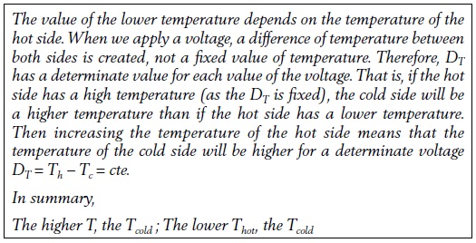 Here the main conclusion is that "increasing the temperature of the hot side the temperature of the cold side will be higher for a determinate voltage DT = Th - Tc = cte". The student is using "the value of the lower temperature depends on the hot side's temperature" as a warrant and "DT has a determinate value for each value of the voltage" as data.