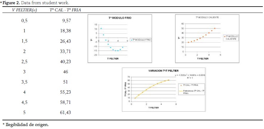 Data are the factual background to any argument. They trace the path towards a conclusion or a claim. An example of data from a group's work is illustrated in Figure 2. During the proposed problems, students should be able to take relevant information (data, evidence) from measurements either from experiments or simulation program. Students should take in account the system variables together with their accuracy. Despite the emphasis in instruction to use the data in the right scientific-technological language, just only 19.4% of students found out the right expression of the observed phenomenon related to the thermoelectric effect.