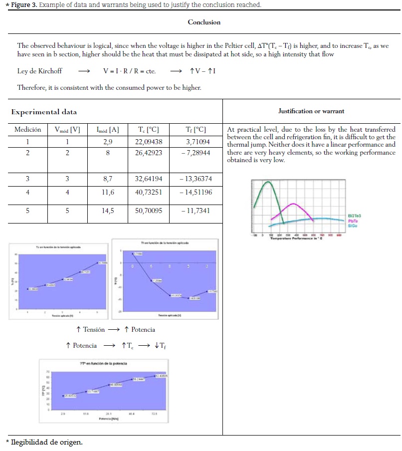 In this example, we identified the main claim of the argument as that "the heat that has been produced depends on the voltage or the intensity and a coefficient." The Peltier effect is used as a justification or warrant for this claim. When the student writes, "In the previous tables (tables I and II) we can observe how the temperature changes similarly between the cold and the hot side of the cell. One can realize that when we increase the applied voltage, we increase the absolute value of both sides, this is, the hot side increases its temperature and the cold side decreases its temperature", he is referring to the empirical data from his experimental work. In summary, in this example, there is an argument with a main claim, reference to empirical data and a warrant to justify how the data relate to the main claim.