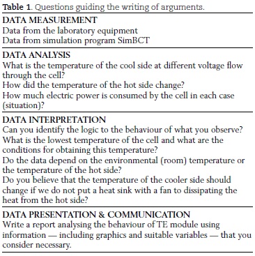 A writing frame was produced including a set of questions to guide the use, analysis, interpretation and presentation of data and conclusions. The questions proposed are convergent and divergent with different difficulty and with an increasing abstraction degree. These questions have different purposes: (a) convergent inquiries try to promote the ability to construct arguments about the knowledge associated with mathematics and science. Such argumentation to converging questions are expected to hold truth value, that is, to be verifiable. For example the question of "What is the temperature of the cool side at different voltage flow?" promotes and records a convergent inquiry; (b) divergent inquiries take place in the concept domain, where the argumentation does not have truth value, which is not necessarily verifiable. Such argumentations involve a higher level of abstraction and difficulty. For example, the question "Can you identify the logic for the behaviour of what you observe?" invites the students to reason by appealing to a range of principles about thermodynamics. Thus students' written tasks were supported with a range of questions so as to enable the manifestation of a range of arguments from those that are readily derived from the use of algebraic equations to those that would require further abstraction and reasoning with qualifiers from a range of theories and principles. The questions on the writing frame are summarised in Table 1.