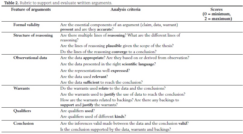 The results of the study suggest that the writing frame with the questions provided to the students (Table 1) to facilitate their writing needs to be supplemented with further scaffolds in order to improve the quality of students' arguments. Given that most issues related to the quality of the formal validity of an argument and the inferences made between the components of an argument, we consider that explicit support of these aspects would help to improve students' writing. Hence we have devised a rubric (Table 2) to supplement the report writing. The rubric again uses the Toulmin model to target particular aspects of argument and are accompanied by a set of questions that the students can reflect on with respect to their own data collection and interpretation. There is also a section on evaluation of the feature of argument suggesting the self- and peer- assessment of the arguments produced in groups.