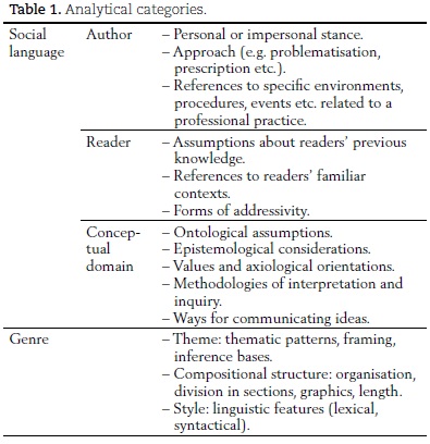 This analytical framing sought to operationalise some parameters that were considered constitutive of social languages by identifying discursive features that can be linked to different professional fields of activity of the authors. According to Bakhtin, elements of a given social language can be integrated in genres (Bakhtin, 1991; Goulart, 2007). In other words participating in a discursive community means to be able to recognise and use a social language and speech genres. In our case we wish to identify aspects of social languages and genres wich were mobilised by the authors. The recognition of the social language was made operational through broad considerations about the ways authors presented themselves, how they represented and addressed their readers and how they described the conceptual domain treated in their texts. Furthermore, and following the relationships between genre and social language, we analysed all texts in terms of their generic features. In doing so, we were attentive to the constraints implied, and potentially imposed, by the suggestion made to authors to write a given text type when the invitation was made. However, we did not assume that the texts were exemplars of one genre or another and paid special attention to the ways descriptions available for each of the formats were interpreted and textually realised by the authors. Therefore, the purpose of mobilising categories related to genre in the analysis was to understand relevant aspects of texts as socially constrained productions, not simply classify them as being one type or another.