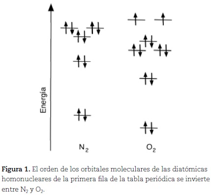 1. Cálculo de la estructura electrónica de moléculas diatómicas homonucleares de la primera fila. El cálculo de Hartree-Fock con base mínima permite observar la inversión en el orden energético de los orbitales moleculares entre la molécula de N2 y la de O2, como se puede ver en la figura 1.