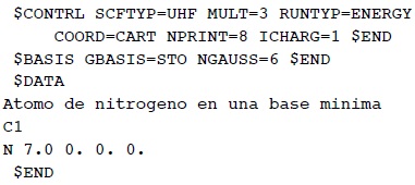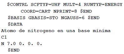 Los programas de química computacional modernos contienen los avances científicos de la disciplina de las últimas décadas. Su empleo pleno es difícil y requiere del dominio de intrincados aspectos de la química cuántica y computacional. Sin embargo, es posible su empleo limitado para hacer cálculos sencillos con parámetros estándar que funcionan aceptablemente bien en la mayoría de los casos. Por ejemplo, una vez que el estudiante ha cargado el disco con el sistema operativo y el programa, sólo hace falta que cree el archivo siguiente para obtener la estructura electrónica del átomo de nitrógeno