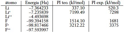2. Cálculo de las dos primeras energías de ionización de los átomos de litio y flúor. El objetivo es calcular las energías de ionización de dos elementos de familias radicalmente distintas. Los resultados del cálculo más sencillo posible (Hartree-Fock, base mínima) producen