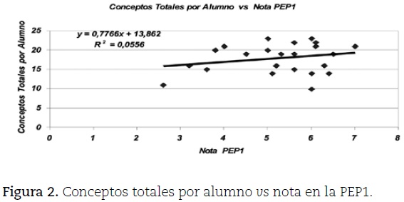 La figura 2 muestra el número de conceptos totales de cada alumno, versus la nota obtenida en la PEP 1, en la escala de 1 a 7, para la unidad de Equilibrio Iónico y el índice de correlación entre ellos.