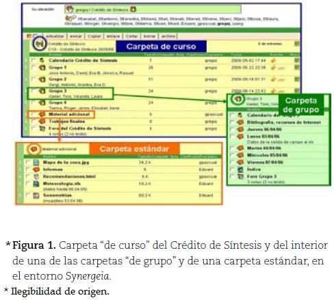 En cuanto al uso de Synergeia, los estudiantes trabajaron cooperativamente dentro de la carpeta "de grupo" asignada a su grupo de trabajo, sin acceso a las carpetas "de grupo" de otros grupos cooperativos. En la carpeta "de curso", el profesorado colgó información para que todos los grupos pudieran completar sus memorias finales, con información como mapas de la zona, datos meteorológicos, etc., y, obviamente, los estudiantes no podían editar o borrar la información ni añadir nuevos contenidos. Cuando la memoria de un grupo había sido completada, tenían que activar un proceso de negociación y cuando éste se superaba, la memoria pasaba a poder ser consultable por todos los estudiantes.