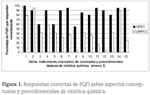 Teniendo en cuenta que existe un mayor porcentaje de profesores de química en formación inicial (PQFI) del GPEC que lograron un mejor desempeño en 14 ítems del instrumento en relación con aquellos que participaron de una enseñanza con características técnicas, evidenciase la pertinencia de este tipo de enseñanza, para el abordaje de cinética química. Sin embargo, no puede decirse que es la solución a los problemas de enseñanza de aspectos conceptuales y procedimentales de aspectos relacionados con este contenido; por el contrario, a pesar de los avances constituidos en esta perspectiva de enseñanza hay que señalar que el aprendizaje de contenidos químicos encierra una verdadera complejidad y dificultades en los estudiantes que de hecho puede evidenciarse en los porcentajes obtenidos en el gráfico 1 para el GPEC.