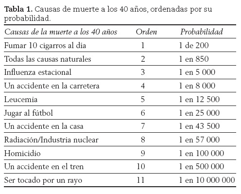 Veamos un poco acerca de un factor importante en la toma de decisiones: la percepción de riesgos. Jonathan Osborne (2004) al dar la charla inaugural de los cursos en el Imperial College en Londres destacó la importancia de la enseñanza del riesgo. Puso las once causas de muerte a los 40 años ordenadas alfabéticamente (en lugar de por su orden de probabilidades, como están en la tabla 1) y pidió a la audiencia (todos jóvenes ingresando a las licenciaturas y posgrados de la institución) que las ordenara por su probabilidad de ocurrencia. Los datos deben ser de la Gran Bretaña, pero no lo dice explícitamente. Luego les mostró las probabilidades reales. Por supuesto el resultado que aportó cada estudiante es notablemente diferente al de la tabla.