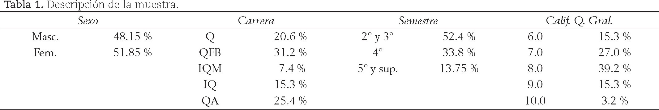 En la tabla 1 aparecen las características de la muestra con respecto a: sexo, carrera y semestre que cursaban, así como la calificación obtenida en Química General, asignatura en la que se abordan los temas fundamentales sobre el lenguaje químico.