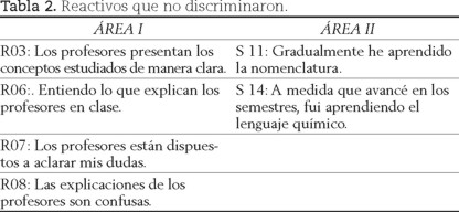 Este análisis se realiza para distinguir si existe variabilidad de respuestas a un reactivo determinado por parte de los sujetos que responden. Para esta investigación, los reactivos que no discriminaron fueron seis que pertenecían a las áreas I y II (tabla 2).