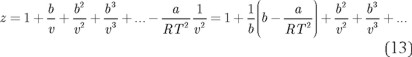 Comparison of eq 12 with the virial expansion z = 1 + B/v + C/v2 + ... indicates that the Berthelot equation of state predicts that the second virial coefficient is