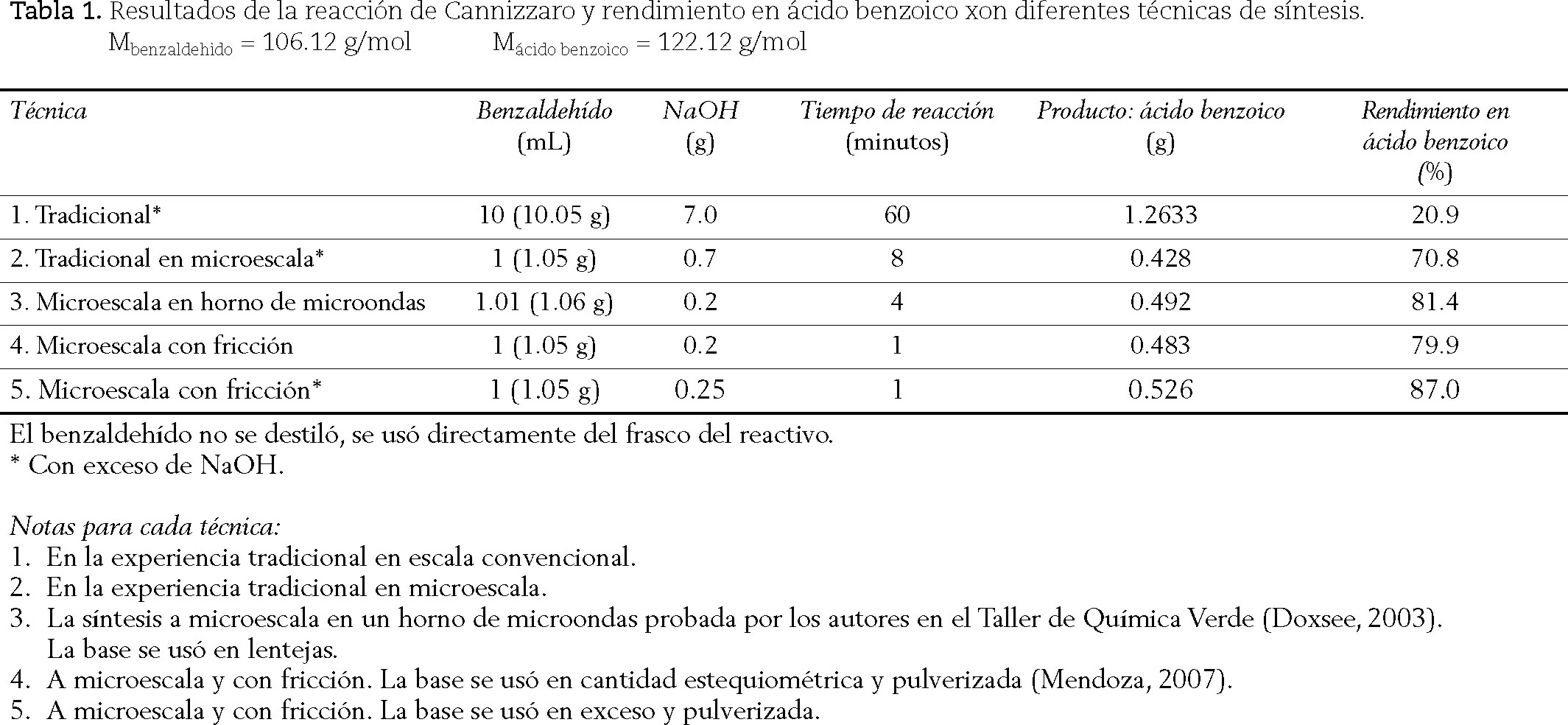 La experimentación de "Química Verde en Microescala" de Kenneth Doxsee y María del Carmen Doria en la Universidad Iberoamericana Unidad Santa Fe (Doxsee, 2003), dio la idea a los autores de este artículo a realizar alguna síntesis efectuada en los laboratorios de la Universidad Autónoma Metropolitana Azcapotzalco, aplicando los principios de la Química Verde (Anastas, 1998), considerando disminuir el tiempo de reacción y se seleccionó la reacción de Cannizzaro. La metodología desde entonces desarrollada ha seguido adaptándose (Mendoza, 2007) para dar los resultados de la tabla 1, en el apartado de datos y resultados.