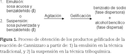 Sin embargo la reacción aquí descrita puede prescindir de catalizadores, ultrasonido, microondas, disolvente o calor haciendo el proceso barato y sencillo (Phonchaiya, 2009; Kazuhiro, 2001) si se aplica un proceso triboquímico el cual puede disminuir el tiempo de reacción (Hixson, 1931) al poner en contacto intenso las fases inmiscibles. La reacción tradicional tiene el inconveniente de poner a los reactivos en fases inmiscibles acuosa (hidróxido de sodio acuoso) y orgánica (benzaldehído líquido), con poca superficie de contacto, lo cual hace la síntesis lenta (1 h). Los reactivos emulsionados pasan a formar un gel como producto a través de un proceso de sustitución nucleofílica (mediante un mecanismo tetraedral) para formar el intermediario de la reacción de Cannizzaro.