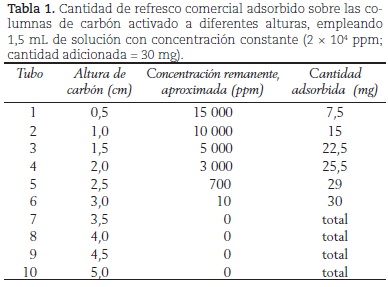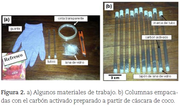 Finalmente, dentro de las causas para desconocer los aspectos relacionados con el estudio de los fenómenos de adsorción en el desarrollo de currículos de secundaria, se encuentra el aparentemente "complicado" razonamiento para explicar los fenómenos de adsorción a este nivel y la marcada carencia de recursos logísticos en los colegios o escuelas de muchos países latinoamericanos. Rutinariamente, para el desarrollo de prácticas de adsorción se requieren equipos técnicos especializados, como sortómetros (para la adsorción de gases) y espectrofotómetros (para determinar la concentración de especies químicas en solución acuosa), o en casos sencillos realizar una serie de titulaciones engorrosas. Sin embargo, el uso de recursos domésticos o de bajo costo, permitiría superar grandes obstáculos en la implementación de actividades sobre fenómenos de adsorción en escuelas, colegios y en cursos básicos de química en la universidad. Por ello, y teniendo en cuenta la importancia de las prácticas de laboratorio en los procesos de aprendizaje en química (Hofstein y Mamlok-Naaman, 2007), el presente trabajo busca ilustrar las propiedades que posee un carbón activado preparado a partir de cáscara de coco (un residuo doméstico) en la adsorción de los colorantes contenidos en refrescos de uso común en el hogar. Adicionalmente, y aún más importante, se pretende llegar a la ecuación clásica de Langmuir para adsorción física, mediante los resultados de adsorción-desorción obtenidos empleando columnas de carbón activado de fácil preparación y la elaboración de una escala colorimétrica.