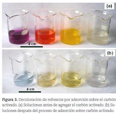 La figura 3 muestra la decoloración de las soluciones de refresco como consecuencia de la adsorción de las moléculas colorantes sobre el carbón activado. Esto revela la potente adsortividad del material preparado a partir de cáscara de coco y los excelentes resultados con respecto al proceso de preparación. Además, explica el porqué este material es utilizado exitosamente en procesos de purificación de aguas, entre otros. Alrededor de este resultado, el docente debe dirigir la discusión de sus estudiantes sobre dos aspectos: los procesos químicos involucrados en la preparación del carbón activado (calcinación controlada y activación con ácido nítrico: reacciones de óxido-reducción y estequiometría), y el fenómeno "fisicoquímico" de la adsorción de los colorantes sobre la superficie del carbón activado.