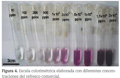 Por otra parte, se desarrolló una fase complementaria (un poco más avanzada) para llegar a la ecuación de Langmuir. Para esta etapa se preparó previamente una escala colorimétrica a partir de diferentes concentraciones de solución del refresco seleccionado (uva), con el fin de lograr una determinación aproximada (por comparación del color) de la concentración de las soluciones de este refresco después de estar en contacto con el adsorbente (carbón activado). La escala se construyó mediante dilución de una solución inicial de 2 x 104 ppm (equivalente a 2 % p/V) de refresco en agua destilada (reemplazable por agua purificada para consumo humano), para obtener las concentraciones siguientes (en ppm): 2 x 104, 1,5 x 104, 1 x 104, 5 x 103, 2 x 103, 1 x 103, 500, 200, 100, 10 y 0 (figura 4). La concentración 0 ppm corresponde a agua sola.