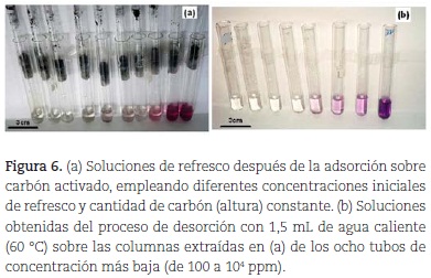 Para verificar la ecuación de Langmuir se efectuaron dos ensayos de adsorción y uno de desorción: el primero, variando la altura de la columna de carbón activado, lo cual corresponde a una variación en la cantidad del adsorbente (y, por tanto, del área superficial disponible para la adsorción), manteniendo constante la concentración del adsorbato (colorante). Para este ensayo, se hicieron pasar (por efecto de gravedad) 1,5 mL de solución 2 x 104 ppm de refresco por el interior de cada columna colocada dentro de un tubo de ensayo de aproximadamente 8 cm de largo (la adición con jeringa de 2 mL se hace casi de manera simultánea rápidamente en todas las columnas, para que el tiempo de contacto del carbón con la solución, al final del ensayo, sea aproximadamente el mismo. Se esperó que bajara todo el volumen de solución en cada columna y se dejó ésta en contacto con la solución durante 45 minutos, con el objeto de esperar que el sistema alcanzara el equilibrio (figura 5). Después se retiró cada columna y se comparó el color de la solución de cada tubo de ensayo con la escala de colores previamente elaborada, determinando de manera aproximada la concentración remanente.