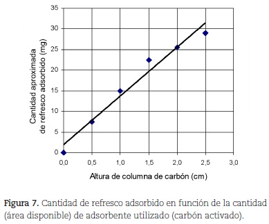 Por otro lado, la tabla 1 y la figura 7 muestran los resultados de la dependencia de la adsorción del refresco (uva) con respecto al área del adsorbente (altura o cantidad de carbón activado), empleando una concentración (C) constante. La figura 7, obtenida a partir de la correlación de los primeros cinco puntos de la tabla 1, revela de manera aproximada una dependencia lineal que pasa por el origen (con un coeficiente de correlación de r = 0,9843), típica de una relación directamente proporcional entre dos variables.